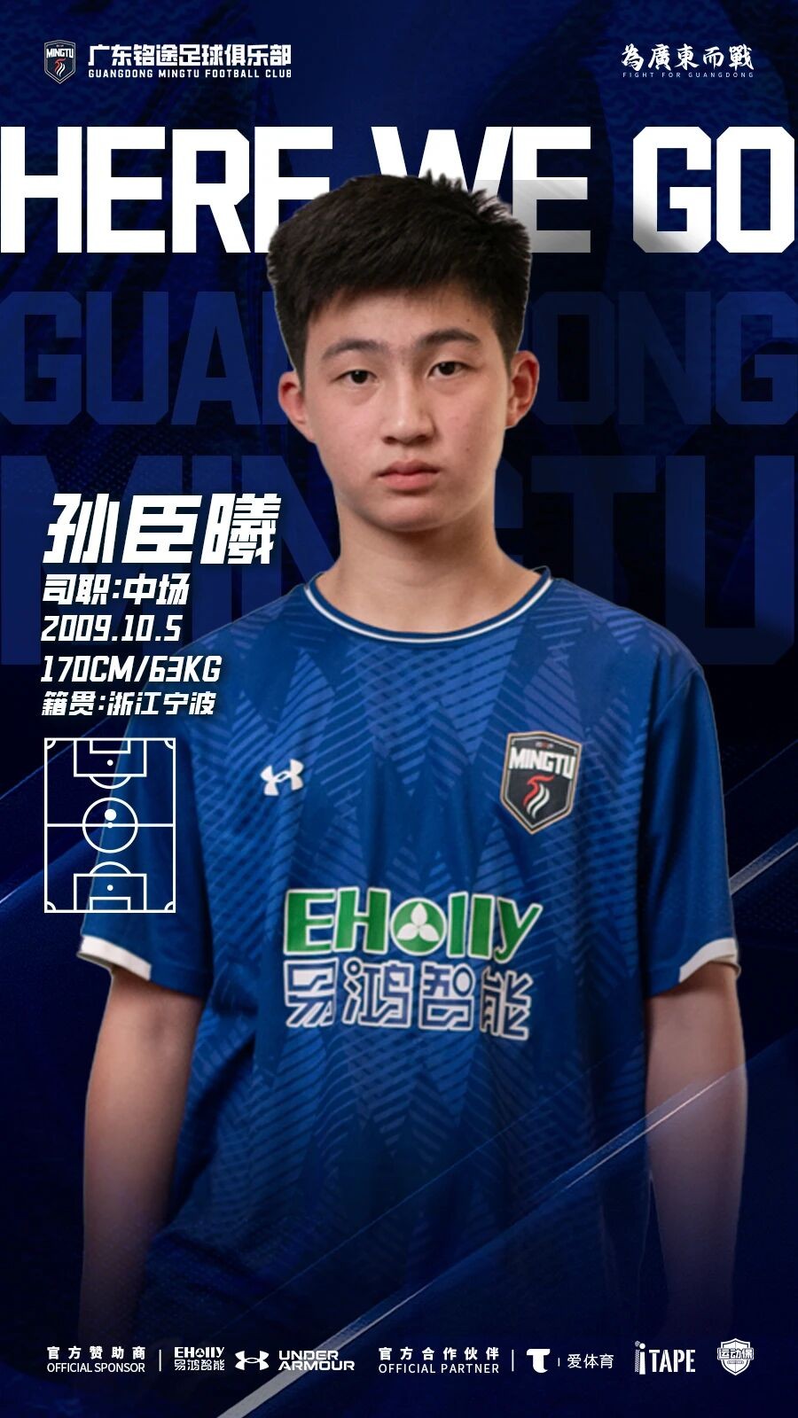 12月5日,中乙广东铭途足球俱乐部官方宣布:(画外音)青训小将孙臣曦、杨政毅,正式踏入一线队大门!官方公告如下:(画外音)基于俱乐部赛季发展规划,以及教练组、技术团队对球队整体架构与未来竞争力的综合评估,并与俱乐部青训队伍及球员本人充分沟通协商,双方达成一致:(画外音)青训梯队优秀队员孙臣曦,正式晋升至广东铭途足球俱乐部一线队!从青训到职业,一步一脚印,汗水浇灌梦想。(画外音)期待你在更高的舞台上